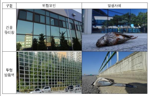 야생조류 투명창 충돌 실태를 조사한 결과, 폐사한 조류는 멧비둘기 등 대부분 소형 텃새로 나타났으며 새들이 건물 유리창이나 투명 방음벽 등 투명창에 충돌해 폐사하는 것으로 추정된다.
