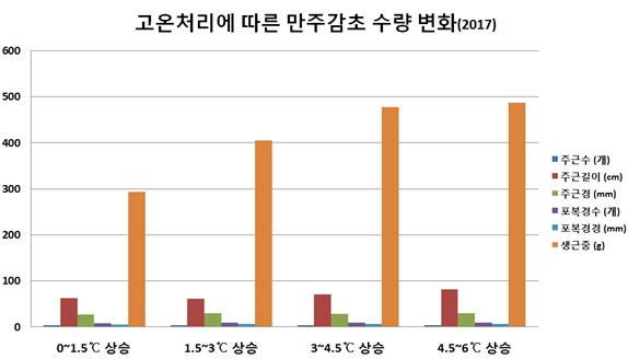 이를 확인하고자 만주감초 2년생을 대상으로 재배 연구를 한 결과, 생육기에 평균 기온이 3℃ 오르면 주 뿌리의 수량이 최대 60%까지 늘어 여름철 고온에도 왕성하게 자라는 것을 확인했다.
