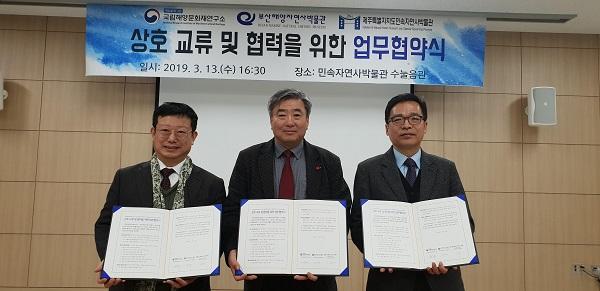 제주특별자치도 민속자연사박물관은 지난 13일 국립해양문화재연구소, 부산해양자연사박물관과의 상호교류 및 협력을 위한 업무협약을 체결했다고 14일 밝혔다.