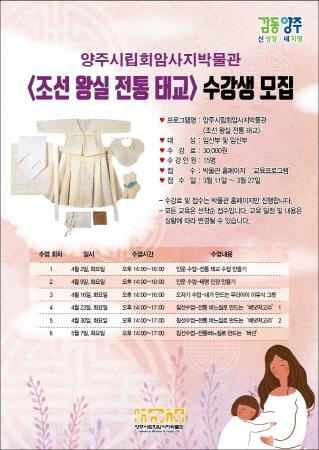 양주시립회암사지박물관은 오는 4월 2일부터 5월 7일까지 매주 화요일 ‘조선왕실 전통태교’ 교육프로그램을 운영한다.