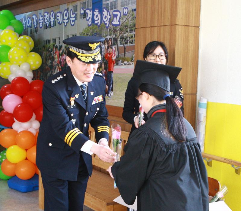 2016. 2. 19(금) 경주경찰서에서는 경희학교(장애우학교) 졸업생(초·중·고) 35명을 대상으로 경찰서장, 포돌이·포순이, 학교전담경찰관(SPO)과 함께 졸업(가족)사진을 촬영하고 액자를 제작하여 전달, 추억을 간직할수 있는 흥미로운 졸업식 행사를 가졌다.