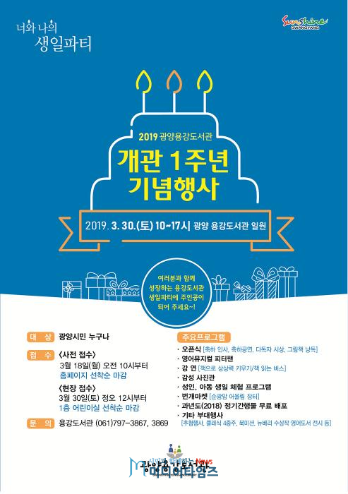 1주년 기념행사 프로그램 사전접수는 오는 18일 월요일 오전 10시부터 광양시립도서관 홈페이지(http://lib.gwangyang.go.kr/)에서 선착순으로 가능하며, 일부 프로그램은 행사 당일인 30일 오후 12시 1층 어린이자료실에서 현장 접수 받는다.