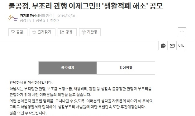 시는 그간 국민생각함과 시 홈페이지를 통해 불공정, 부조리 관행 근절을 위한 『내 주변 생활적폐 개선 공모』를 실시했고 시민제안 7건을 혁신과제로 선정했다.