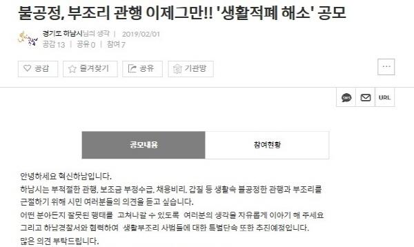 시는 그간 국민생각함과 시 홈페이지를 통해 불공정, 부조리 관행 근절을 위한 ‘내 주변 생활적폐 개선 공모’를 실시했고 시민제안 7건을 혁신과제로 선정했다.
