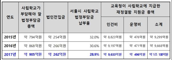 사학법인의 법정부담금 납부율이 감소함에 따라 서울시교육청이 사립학교에 지원하는 재정결함지원금도 매년 증가하고 있다. 서울시 교육청은 최근 3년간 법정부담금을 납부하지 못한 사학법인들을 위해 2015년 9,299억원, 2016년 9,668억원, 2017년 1조 130억원의 재정결함지원금을 투입했다.