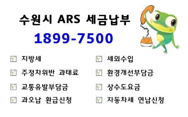 ARS 납부 서비스는 고지서 없이 지방세·주정차위반 과태료·교통유발부담금·상수도요금 등 수원시에서 부과한 세외수입을 조회하고, 신용카드나 휴대전화 소액결제로 즉시 내는 것이다. 과오납금 환급, 자동차세 연납 신청도 할 수 있다.