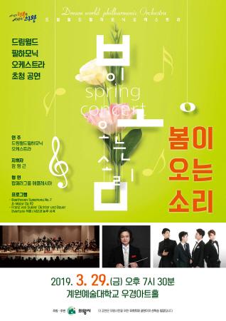 의왕시는 다가오는 봄을 맞아 오는 29일 오후 7시 30분 계원예술대학교 우경아트홀에서 드림월드필하모닉 오케스트라와 함께하는 오케스트라 초청공연 ‘봄이 오는 소리’를 개최한다.