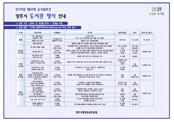 양주시는 오는 4월 제55회 도서관주간을 맞아 꿈나무, 남면, 덕계, 광적도서관에서 다채로운 행사를 운영한다.