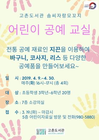 이번 어린이 공예 교실은 관내 3학년 이상 초등학생들을 대상으로 4월 9일부터 30일까지 총 4차시에 걸쳐 매주 화요일 오후 4시에 한 시간 가량 진행된다.