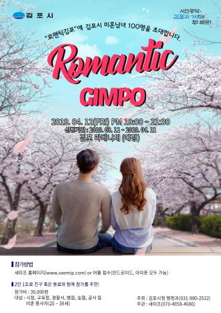 김포시가 김포한강신도시 금빛수로 라베니체 거리에서 시 공무원, 관내 공공기관, 관내 기업 등 미혼 직원들이 참가하는 미팅 이벤트 '로맨틱 김포'를 오는 4월 12일 진행한다.