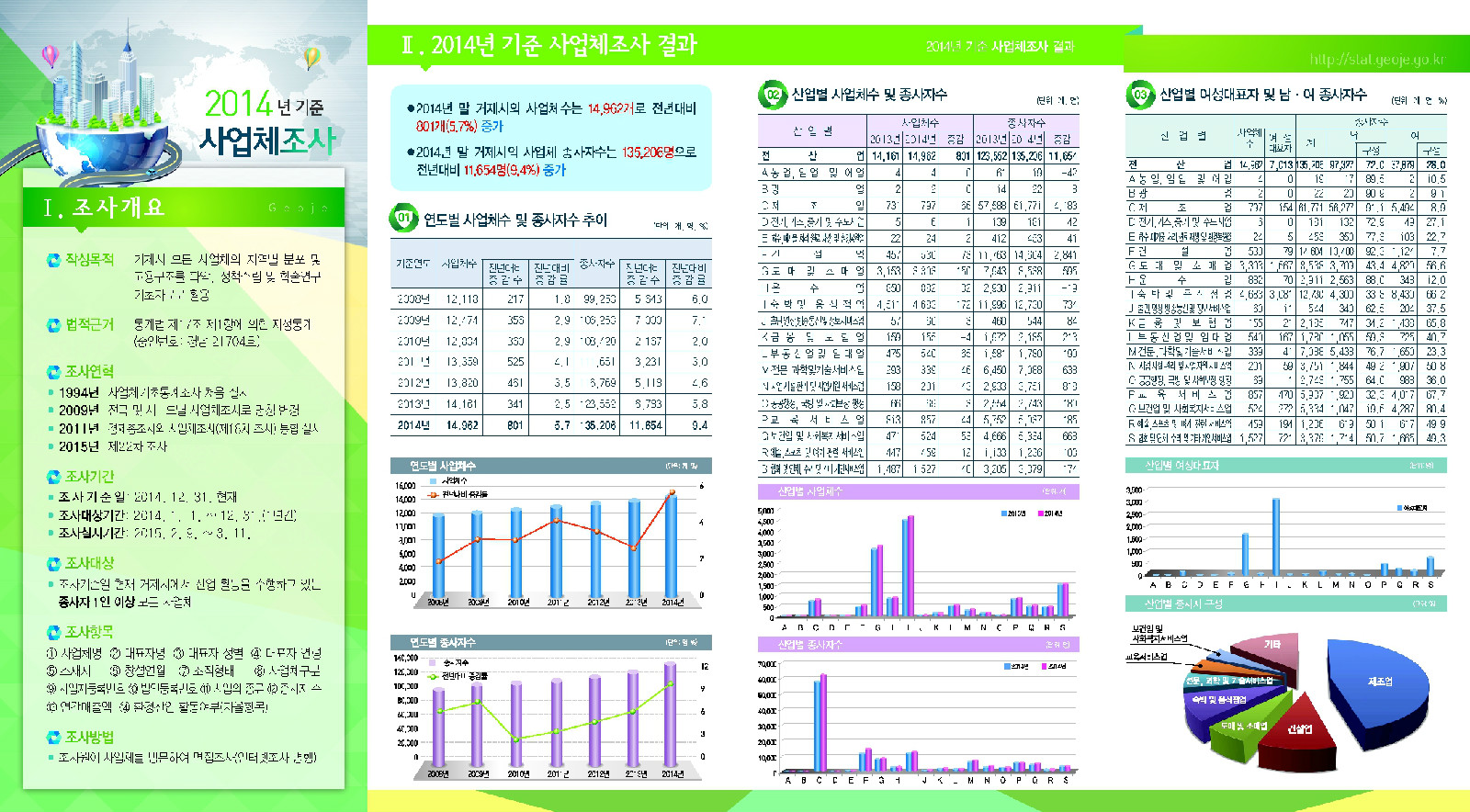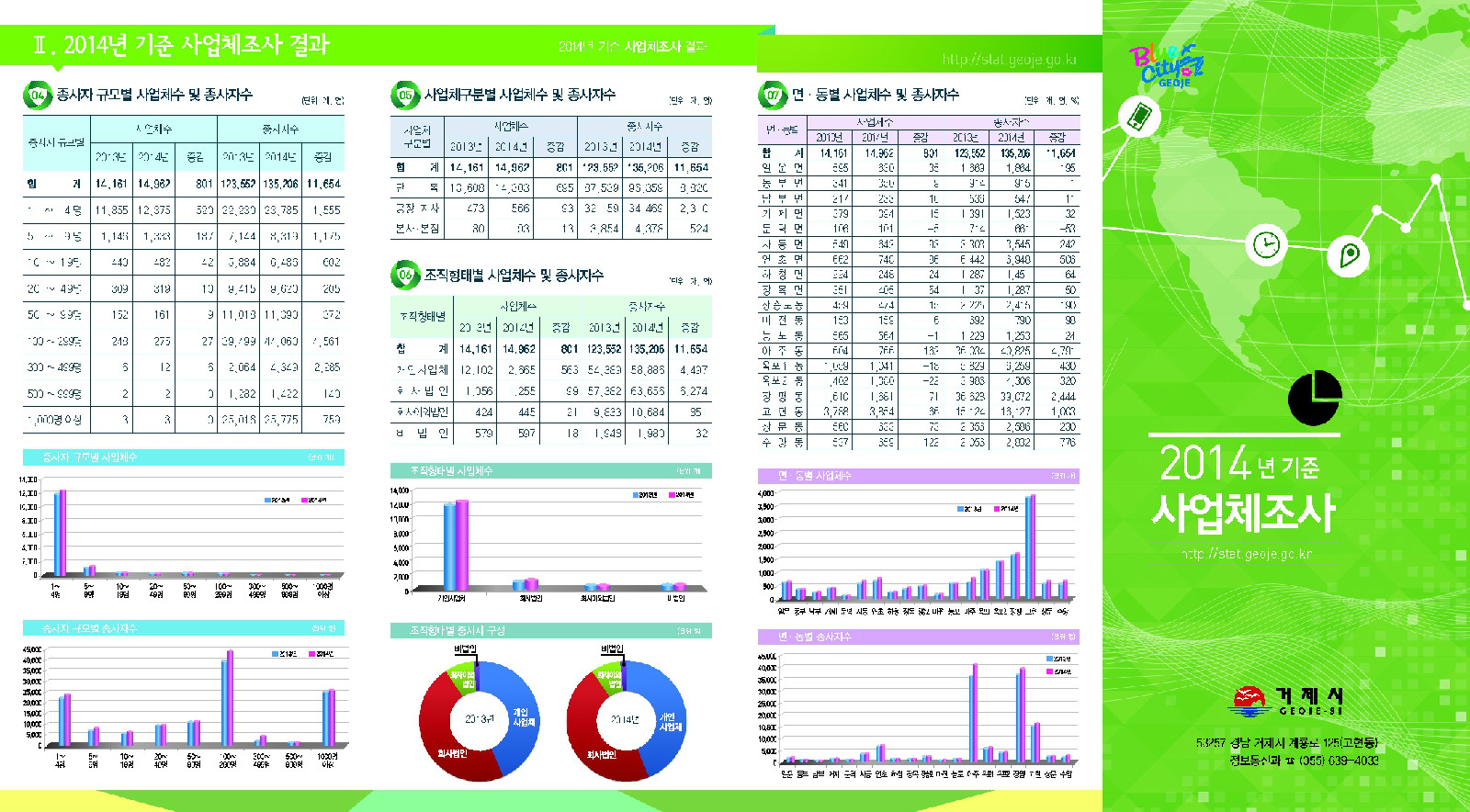 거제시(시장 권민호)는 2014. 12. 31.현재 지역 내에서 산업 활동을 수행하고 있는 종사자 1인 이상 모든 사업체를 대상으로 2015년 2월 9일 부터 3월 11일까지 실시한 『2014년 기준 사업체조사』결과를 리플릿으로 제작했다.