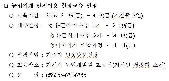 거제시 농업기술센터(소장 옥경도)는 2월 19(금)부터 4월 1(금)까지 오전 9시~18시, 8시간 교육을 총 3회에 걸쳐 농업기계 안전이용 현장교육을 실시할 계획이다.