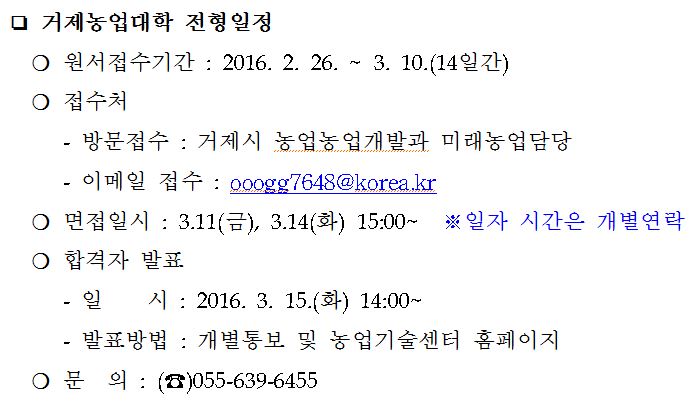 거제시농업기술센터(소장 옥경도)는 오는2월 26일부터 3월 10일까지 2016년도 거제농업대학 신입생을 모집한다.