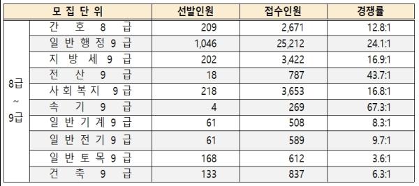 접수인원이 전년대비 61.4% 줄어든 것은 타 시·도와 시험일자 통일, 타 시·도 채용규모 증가로 수험생이 분산되고 40%에 달하는 필기시험 결시생 허수가 빠졌기 때문으로 분석된다.