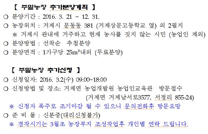 거제시농업기술센터에서는 가족과 함께하는 여가 선용과 도시민의 안전한 먹거리를 위하여 주말농장 추가접수를 오는 3월 2일(수) 거제면 농업개발원 농업인교육관에서 9:00부터 선착순 실시한다.