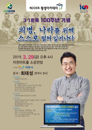 이번 평생아카데미는 2019년 첫 번째 아카데미 강연으로, 대한민국 임시정부 수립과 3·1운동 100주년을 기념해 ‘의병, 나라를 위해 스스로 떨쳐 일어나다’를 주제로 일제강점기 나라를 구하기 위해 전개된 이름 없는 민초들의 항일 의병 이야기를 얼마 전 인기리에 종영한 드라마 ‘미스터 션샤인’의 명장면과 함께 만나보는 유익한 시간을 가질 예정이다.