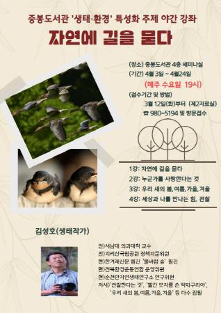 김포시 중봉도서관은 오는 4월 3일부터 4월 24일까지 매주 수요일 저녁 7시, 생태작가로 왕성한 활동 중인 김성호 작가를 초청해 “자연에 길을 묻다”라는 주제로 강좌를 운영한다.