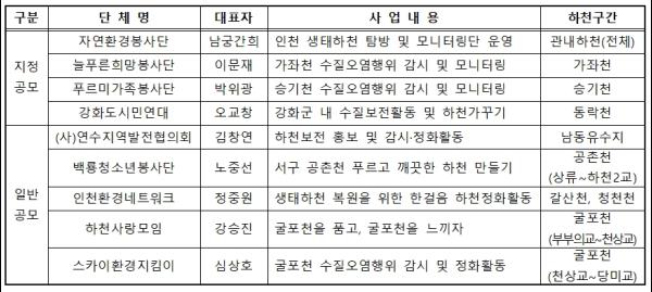 협약 체결에 앞서 인천광역시는 수질개선 활동에 시민참여를 유도하고, 깨끗한 하천 조성과 수질오염행위 감시 및 시민 환경의식 제고에 기여하기 위해 지난 2월 15일까지 수질보전활동을 추진할 민간단체를 공개 모집을 했다.