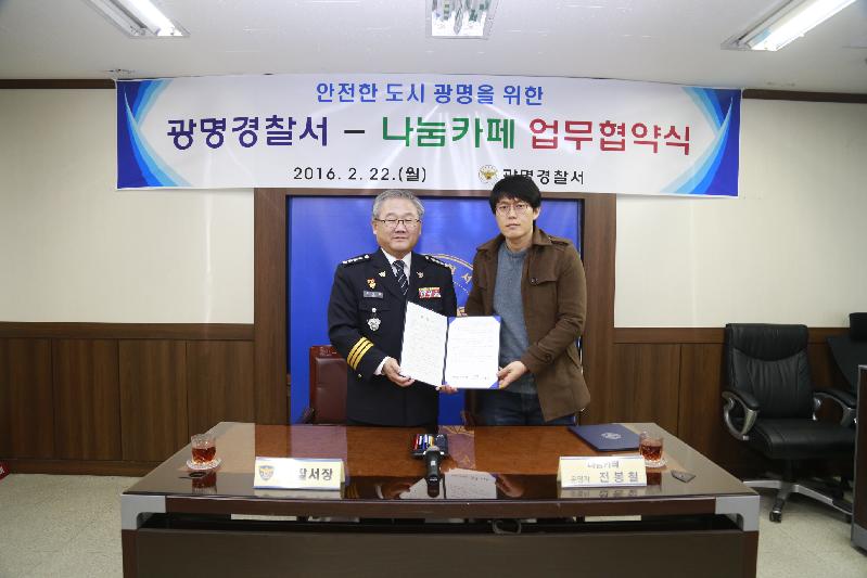 이명균 서장은 “광명 대표 맘카페인 나눔카페와의 업무협약을 통해 시민들에게 더욱 친근하고 깊숙이 다가가 4대 사회악 근절 활동을 홍보하고 시민들의 참여를 유도하여 체감안전도를 향상하고 민관이 함께하는 다채로운 행사들도 기획하여 안전한 광명시를 만드는데 최선을 다하겠다”고 밝혔다. // 신정식 기자 hjsgreen77@hanmail.net