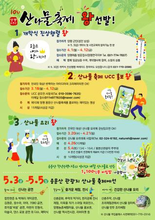 양평군은 오는 5월에 있을 산나물 축제에 빛낼 지역민과 전 국민대상으로 ‘진상행렬 왕, UCC 홍보 왕, 산나물 요리 왕’을 공모를 통해 선발한다.
