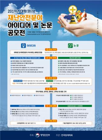행정안전부는 한국방재학회와 공동으로 복합적이고 예측하기 어려운 신종 재난에 대비하기 위해 대학생의 시각에서 국민 안전의 사각지대를 발굴하고 대처하고자 ‘대학생 재난안전 분야 아이디어 및 논문 공모전’을 개최한다.