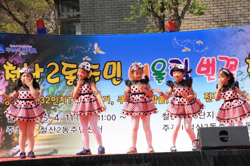광명시 철산2동 주민센터(동장 김지람)는 축제공동추진위원회(위원장 황윤규, 김광인)와 함께 지난 4월11일 철산주공8단지 관리사무소 앞에서 『2015 철산2동 주민 어울림 벚꽃 축제』를 개최해 주민 800여명과 함께 화합의 장을 마련했다. 지역 주민들과 함께「철산2동 축제공동추진위원회」를 직접 구성하고, 참여하여 진행했던 이번 어울림 벚꽃 축제는 주민들이 화합할 수 있는 즐거움의 장으로 자리매김 했다. 철산2동 주민자치센터 농악반의 식전공연을 시작으로 1부 개회식과 2부 주민노래자랑, 댄스스포츠, 광명정보산업고등학교의 스니커즈 방송댄스 등의 다양한 발표와 어린이 미술, 서예 작품전시, 먹거리장터, 솜사탕 나눠주기 등 다채로운 볼거리와 즐길거리를 준비하였으며 푸짐한 선물의 경품행사 등 이벤트도 진행되었다. 주민들의 신청을 받아 이루어진 주민노래자랑에는 이옥분씨가 최우수상을 차지하였으며, 프로마술사 김민형의 공연으로 축제의 열기를 이어갔다. 이번 축제를 주최한 황윤규 주민자치위원장은 “주민들이 직접 참여하여 만든 축제여서 의미가 깊고 철산2동 주민들이 함께 만든 소통과 화합의 장이였으며, 주민에게 다양한 여가 시간을 제공하여 뿌듯하다”라고 밝혔다.