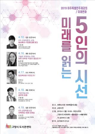 고양시 대화도서관은 ‘2019 아주 특별한 주제’의 일환으로, 오는 4월 ‘미래를 읽는 5인의 시선’ 강연을 개최한다. 2016년부터 시작된 강의는 연중 프로젝트로, 매달 한 가지 주제에 대해 해당 분야의 각 전문가를 초청해 다양한 해석과 지식을 접할 수 있는 수준 높은 인문학 강의이다.