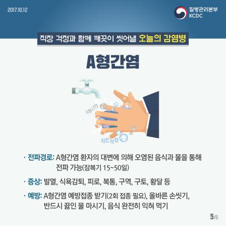 A형간염은 개인위생 관리가 가장 중요하다. 화장실에 다녀온 뒤에는 꼭 손을 씻고, 개인용 세면도구와 식기류를 사용하는 것이 예방에 도움이 된다. 특히 회식자리에서는 여러 사람이 함께 음식을 나눠먹거나 술잔을 돌리는 일은 금해야 하며, 단체생활을 하는 학교나 군부대에서는 함께 쓰는 정수기에 입을 대고 마시지 않고 꼭 개인 컵을 사용하는 것이 중요하다.