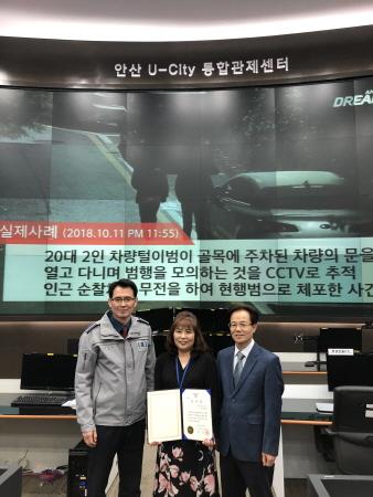 관제요원은 지난 14일 새벽 2시경 성포동 농협 앞 승용차량 안에서 남성이 풍선에 무엇인가를 주입해 반복해서 흡입하는 행동을 수상히 여겨 경찰관에게 통보했으며 경찰에서는 즉시 출동해 범인을 검거하게 됐다. 이에 상록경찰서에서는 22일 관제요원에게 감사의 뜻을 전해왔다.