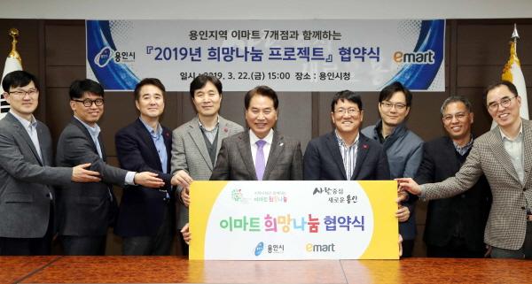 용인시는 22일 관내 이마트 7개점과 저소득층을 지원하는 ‘2019 희망나눔 프로젝트’ 협약을 맺었다고 밝혔다. 이날 협약식에는 백군기 용인시장과 최경종 이마트 강원동부권역 총괄 등 8명이 참석했다.