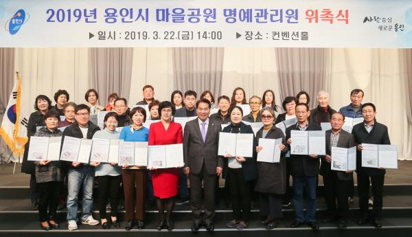 용인시는 22일 시청 컨벤션홀에서 이용자 중심의 공원 환경을 만들기 위해 활동할 마을공원 명예관리원 68명을 위촉했다.