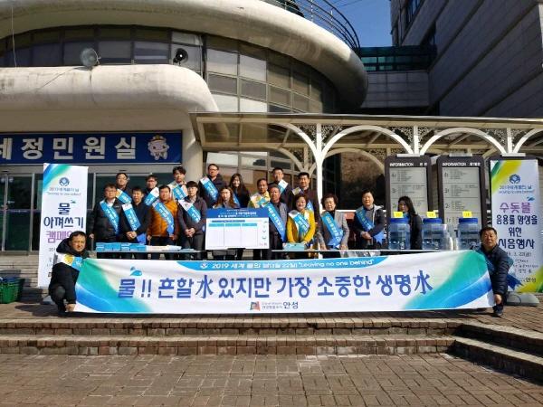 안성시 상수사업소는 22일 오전 10시부터 시청 세정민원실 앞에서 안성시 수돗물평가 위원회 및 관계 공무원이 참석한 가운데 시민을 대상으로 ‘2019년 세계 물의 날’ 기념행사를 개최했다.