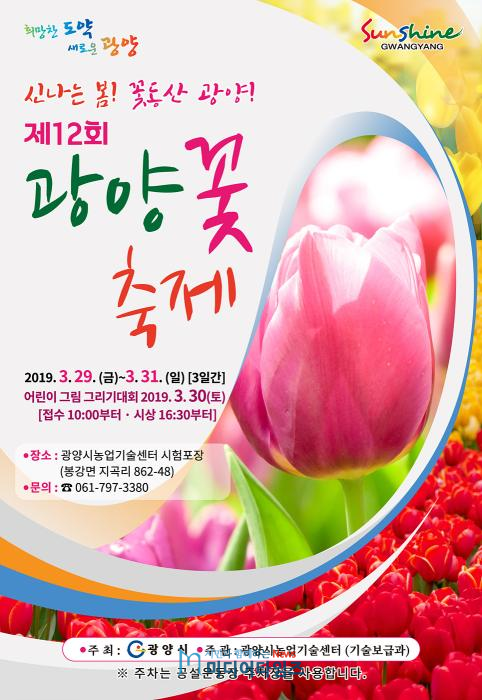 한편 제12회 광양꽃축제는 오는 3.29. ~ 3.31. ‘신나는 봄! 꽃동산 광양!’을 주제로 봉강면 지곡리에 위치한 농업기술센터 시험포장에서 개최한다.