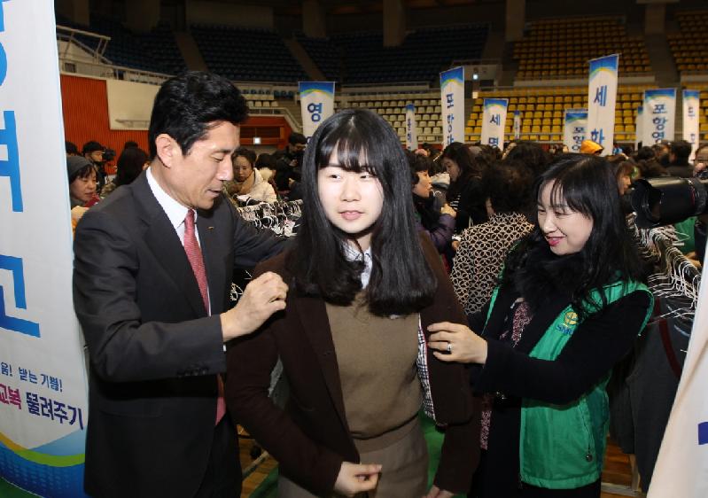 포항시새마을회(회장 최현욱)는 23일 포항체육관에서 학생 및 학부모 2,000여명이 참가한 가운데 ‘2016년 사랑과 나눔의 교복 물려주기 행사’를 성황리에 개최했다. 이날은 관내 39개 중·고등학교가 참가한 가운데 선후배간의 따뜻한 정을 나누고 학부모들의 가계 부담을 줄여주기 위해 기증받은 교복을 저렴한 가격(동복 10,000원, 하복 6,000원)으로 판매했다. 새마을회는 참가 학교별로 교복을 수거하고 포스코휴먼스의 지원을 받아 1차 수선 및 세탁을 실시했으며, 행사 당일에도 학생 사이즈에 맞게 무료수선 서비스를 제공해 학생과 학부모들로부터 큰 호응을 얻었다. 교복을 구입한 정현숙(유성여고 3년) 양은 “험하게 입어 다 해진 교복을 입고 다닐 생각에 걱정이 많았는데 깨끗한 교복을 싸게 살 수 있어서 기쁘다”며 “선배들이 깨끗이 입고 물려주신 교복을 감사히 잘 입겠다”고 말했다. 이강덕 포항시장은 “학부모들의 가계 부담을 줄일 수 있을 뿐만 아니라 학생들에게도 좋은 가르침이 되는 교복 물려주기 행사를 포항시의 아름다운 문화로 승화시킬 수 있도록 행사를 지속적으로 추진하겠다”며 “더불어 살아가는 사회분위기 조성에 기여해주신 새마을회원과 자원봉사자 여러분들의 노고에 감사한다”고 말했다. 한편 지난 2009년부터 개최된 교복 물려주기 행사는 매년 10,000여점의 교복을 기증받아 판매하고 있다. 포항시새마을회는 지난해 행사 수익금 1,020만원 전액을 참여 학교 교복지원금으로 전달했으며, 올해 행사 수익금은 저소득 학생들의 장학금으로 전달할 계획이다.