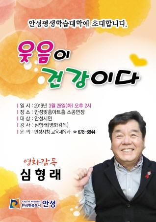 안성시는 오는 26일 오후 2시 안성맞춤아트홀 소공연장에서 안성평생학습대학 1회차 강연으로 심형래 영화감독을 초청해 ‘웃음이 건강이다’라는 주제로 유머가 우리 삶에 미치는 영향에 대해 강연을 펼친다.
