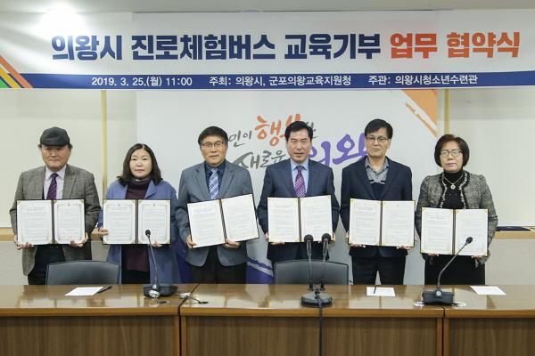 의왕시는 25일 시청 소회의실에서 군포의왕교육지원청 및 버스 운송업체와 진로체험버스 교육기부 업무협약식을 가졌다.
