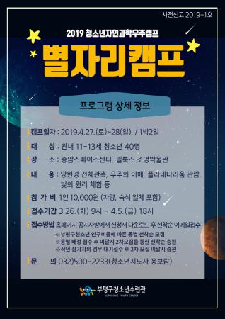 부평구청소년수련관은 부평지역 초등학교 4~6학년 40명을 대상으로 2019년 별자리캠프 ‘청소년자연과학우주캠프’ 참가자를 모집한다.