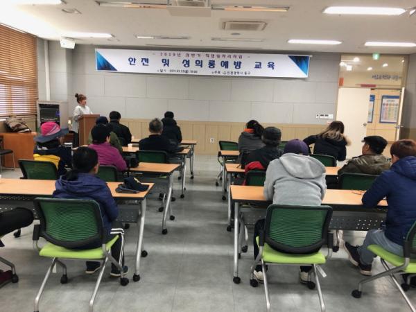 인천 동구는 25일, 동구 주민행복센터에서 2019년 상반기 지역공동체일자리·공공근로 사업 참여자 16명을 대상으로 안전 및 성희롱예방 교육을 실시했다.