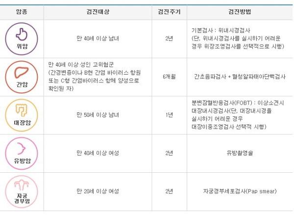 국가에서는 조기검진의 인식을 제고하고 암을 조기에 발견 및 치료함으로써 치료율을 높이고 암으로 인한 경제적 부담을 줄이기 위해 국가 5대 암 검진사업을 실시하고 있다. 올해 국가 암 검진 대상자는 홀수년도 출생자로 국민건강보험공단에서 송부한 검진표와 신분증을 지참하고 지정된 암 검진기관에 예약 후 방문하면 된다.