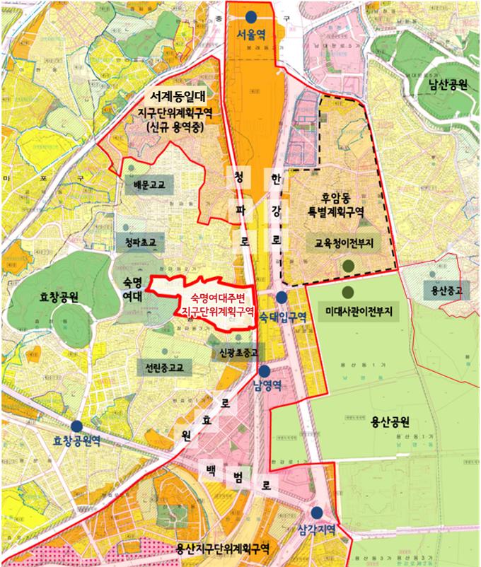 숙명여대주변 지구단위계획구역은 숙명여대 주변지역의 노후환경 정비, 지역적 이미지 제고, 지역활성화를 위해 지난 2008년 지구단위계획을 처음 수립하였으나, 과도한 획지계획과 특별계획구역 지정 등으로 인해 계획 실현성이 저조함에 따라 이의 해소를 위해 주민 의견 및 현실 여건 등을 반영한 재정비를 추진하게 되었다.