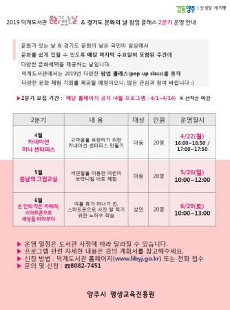 양주시 덕계도서관은 오는 4월 1일부터 문화가 있는 날‘팝업 클래스’2분기 참여자를 모집한다.