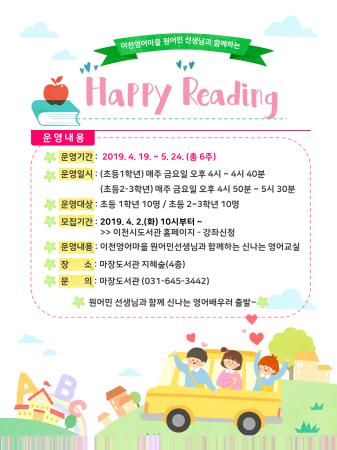 초등학생 1~3학년을 대상으로 진행하는 ‘Happy Reading’은 4월 19일부터 5월 24일 까지 매주 금요일 오후 4시부터 4시 40분, 오후 4시 50분부터 5시 30분 2차례 운영한다