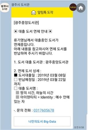 시 관계자는 “카카오 알림톡 도입으로 도서관을 이용하는 시민들에게 보다 편리하고 신속한 맞춤형 서비스 제공 및 홍보를 통해 ‘책과 함께하는 문화도시 광주’ 이미지 제고에 앞장설 것”이라고 말했다.