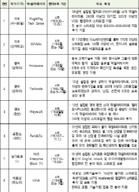 중소벤처기업부는 “국가별 현지 액셀러레이터를 통해 차별화된 진출 프로그램을 제공해 창업기업이 목표로 하는 현지시장의 니즈를 반영한 제품 개발과 시장기회를 발견하고 활용할 수 있도록 창업기업의 글로벌 역량을 강화하고 성공적인 해외진출을 지원하겠다.“고 밝혔다.