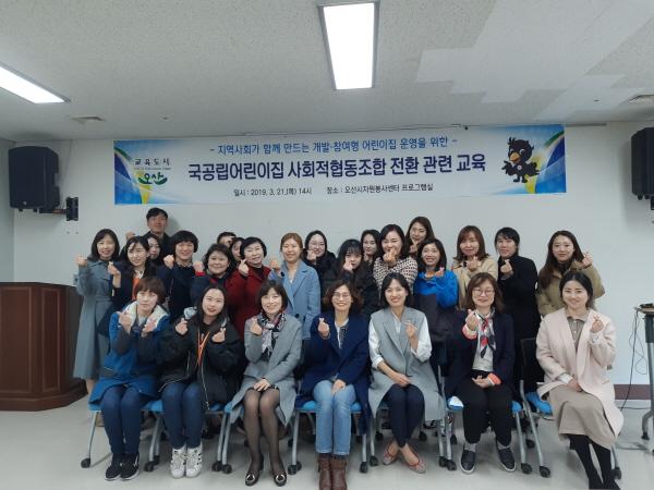 오산시는 학부모와 지역사회가 함께 하는 개방 참여형 육아환경을 구축하기 위해 관내 국공립어린이집을 사회적협동조합으로 전환하기로 하고, 전환 대상 6개 어린이집 학부모, 원장, 보육교사 30여명을 대상으로 사회적협동조합 공보육에 대한 교육을 오산시자원봉사센터에서 지난 21일 실시했다.