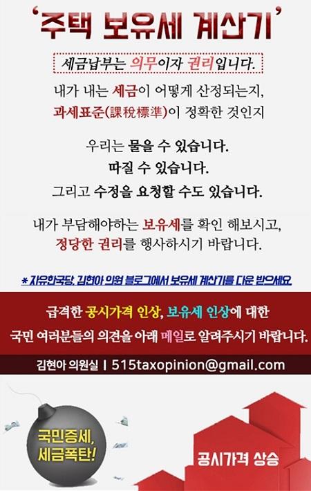 이런 국민의 불안을 해소하기 위해 김현아 의원은 개정된 세법을 반영해 재산세, 지방교육세, 도시계획세, 종합부동산세, 농특세 등 보유세 전체를 확인할 수 있도록 계산기를 제작·배포했다. 또한 계산기에는 재산세와 종부세의 세부담 상한까지 적용했다. 다만 실제 납부해야하는 보유세와는 단순 오차가 있을 수 있다.