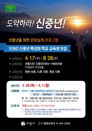 의왕시는 인생100세 시대를 대비해 5060 신중년을 대상으로 행복한 제2의 인생을 위한 은퇴설계 프로그램인‘5060 신중년 특성화 학교’에 참여할 교육생을 모집한다.