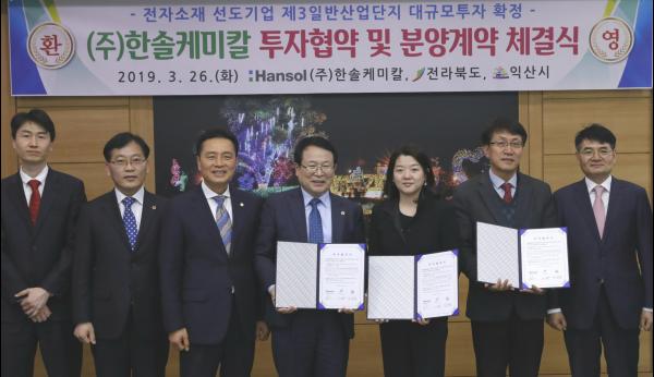 익산시와 전라북도는 26일 익산시청에서 ㈜한솔케미칼 조연주 사장, 정헌율 익산시장, 조규대 익산시의회 의장, 나석훈 전라북도 일자리경제국장, 도의원 4명 등이 참석한 가운데 익산 제3일반산업단지 투자를 위한 투자협약 및 분양계약을 체결했다.