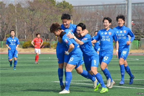 지난 23일 시흥시 정왕체육공원에서 펼쳐진 2019시즌 K3 어드밴스 1라운드 개막전 청주FC와의 경기에서 시흥시민축구단이 정민우 선수의 선제 결승골로 승리를 거뒀다.