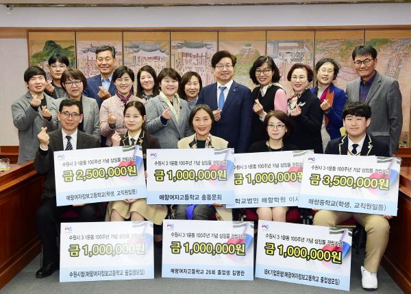 지난 25일에는 매향중학교·매향여자정보고등학교 학생과 교직원, 김호섭 학교법인 매향학원 이사장, 매향여자정보고 총동문회, IBK기업은행·수원시청 매향여자정보고 졸업생 모임, 매향여자정보고 졸업생 등 15명이 수원시청을 방문해 염태영 수원시장에게 기부금 총 1100만 원을 전달했다.